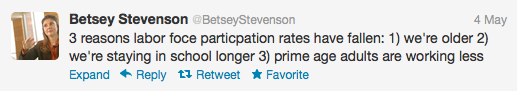 The Federal Bank of Chicago recently published a letter that explains the decline in the Labor Force Participation Rate. In this the authors make the case that just under half of the LFPR decline from a peak of 67.3% in the early 2000s to 64% in December 2011 was for reasons of demography – primarily baby boomers nearing retirement age. Indeed Betsey Stevenson, Economics professor at Princeton and former Chief Economist at the US Department of Labor, tweeted a similar explanation: